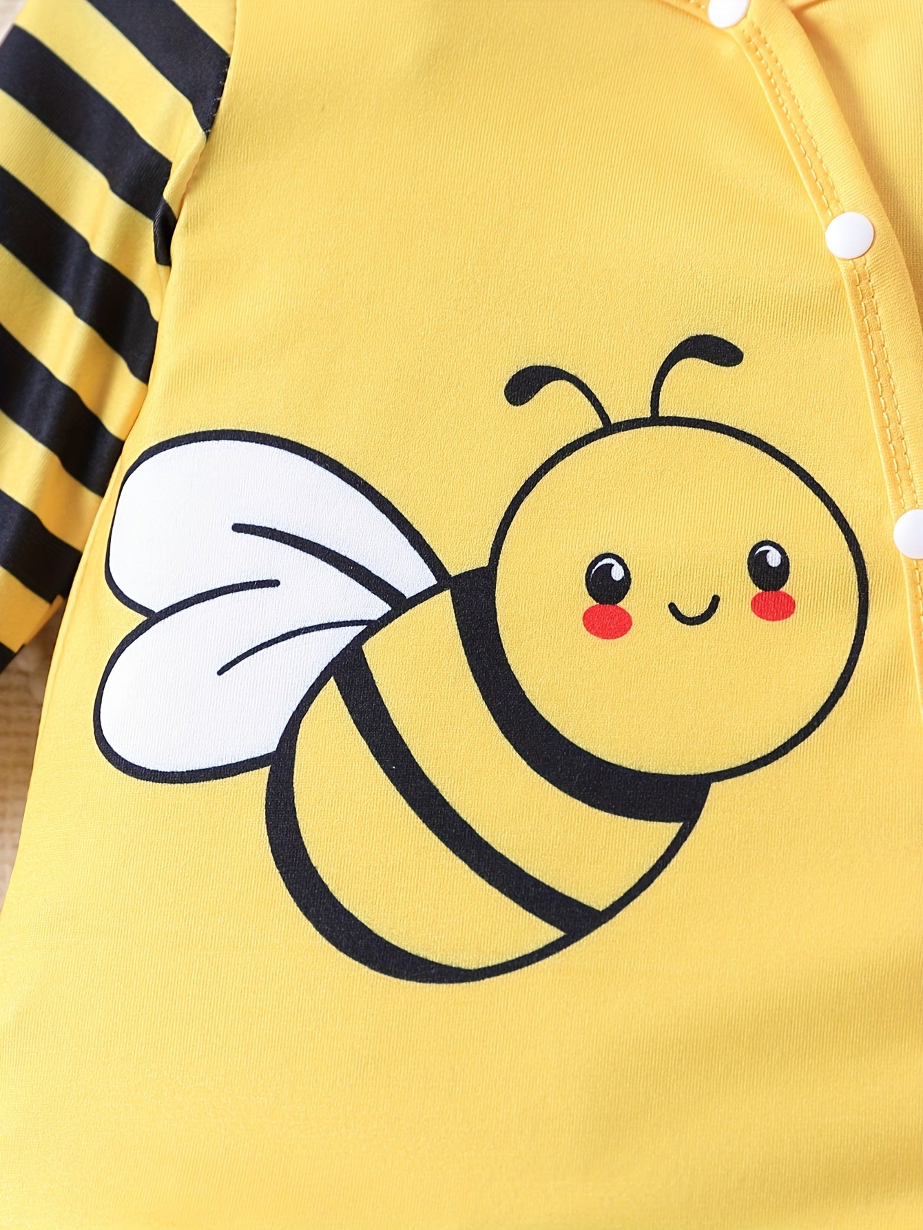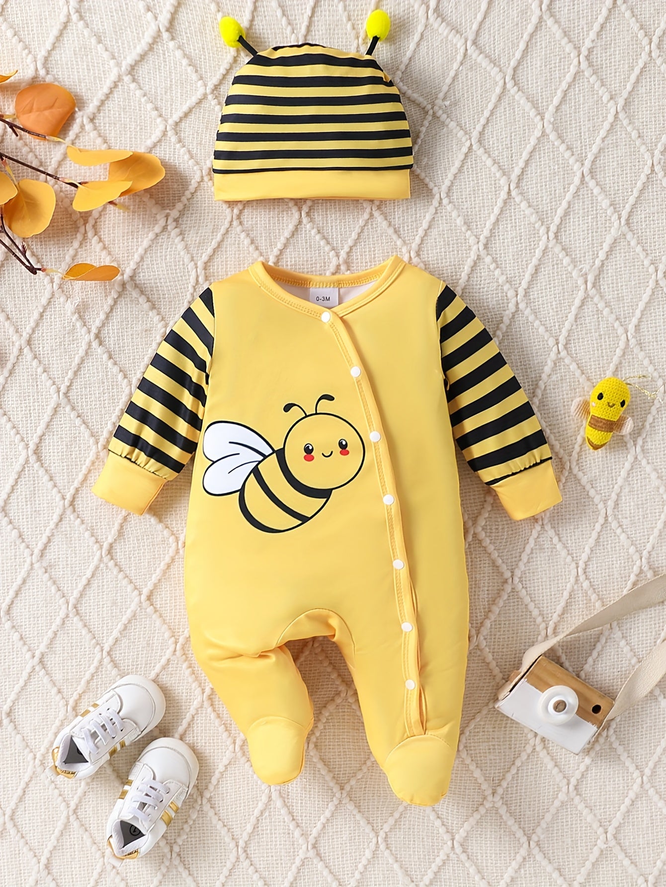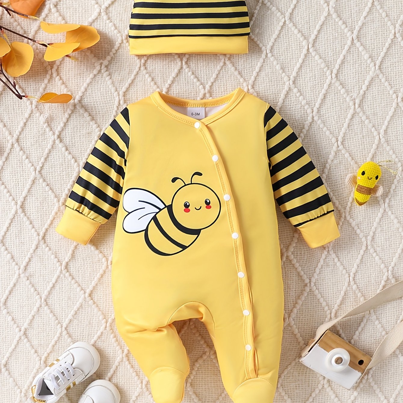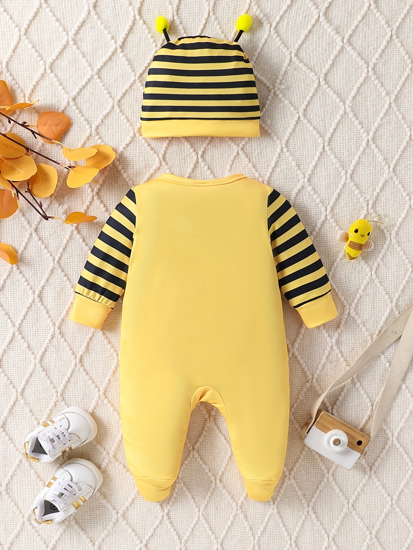 [Cute Cartoon] Children's Girl Cute Cartoon Little Bee Striped Long Sleeve Onesie with Hat | Spring/Autumn Outdoor Wear