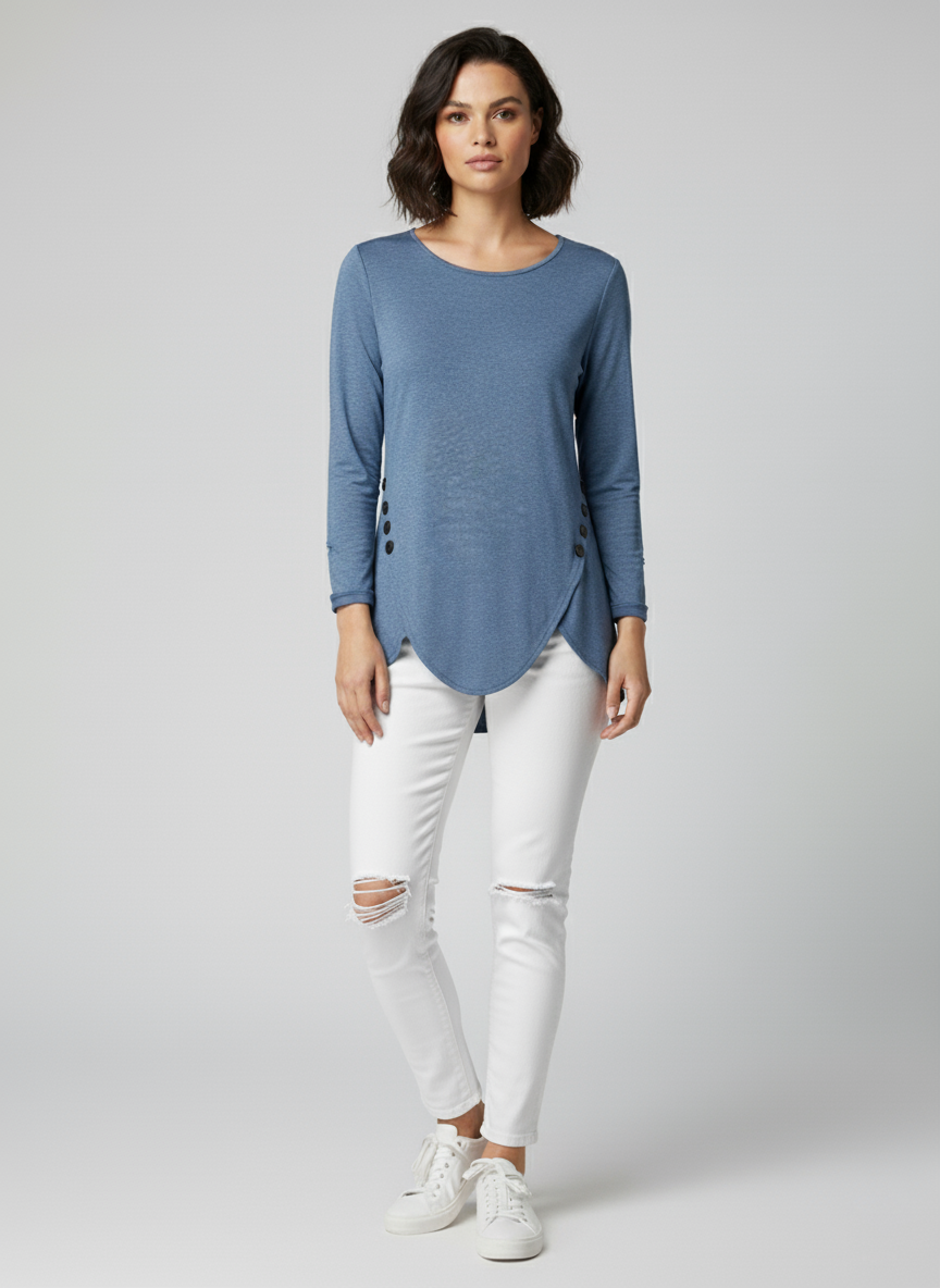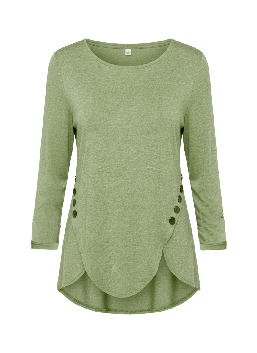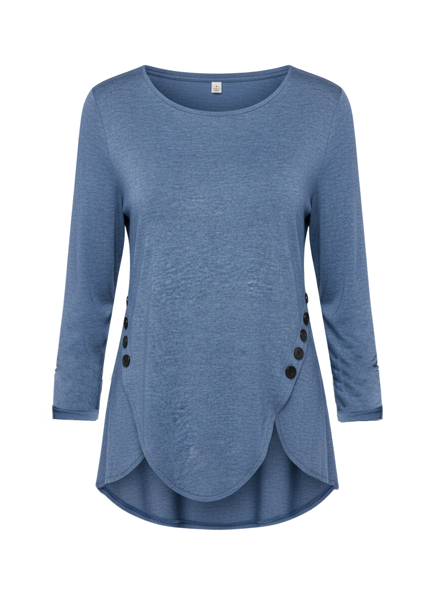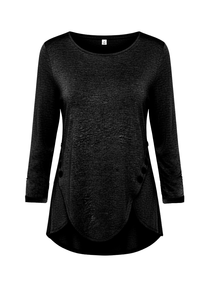 Irregular Button Hem Long Sleeved Round Neck Oversized T-shirt