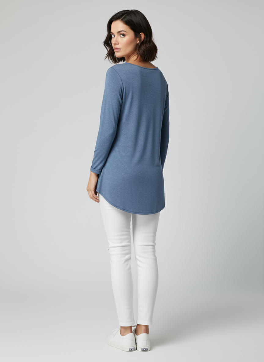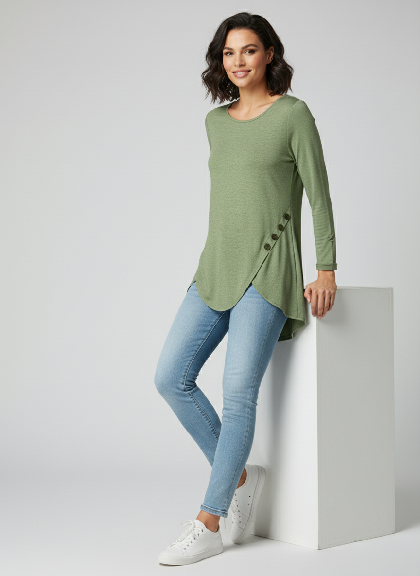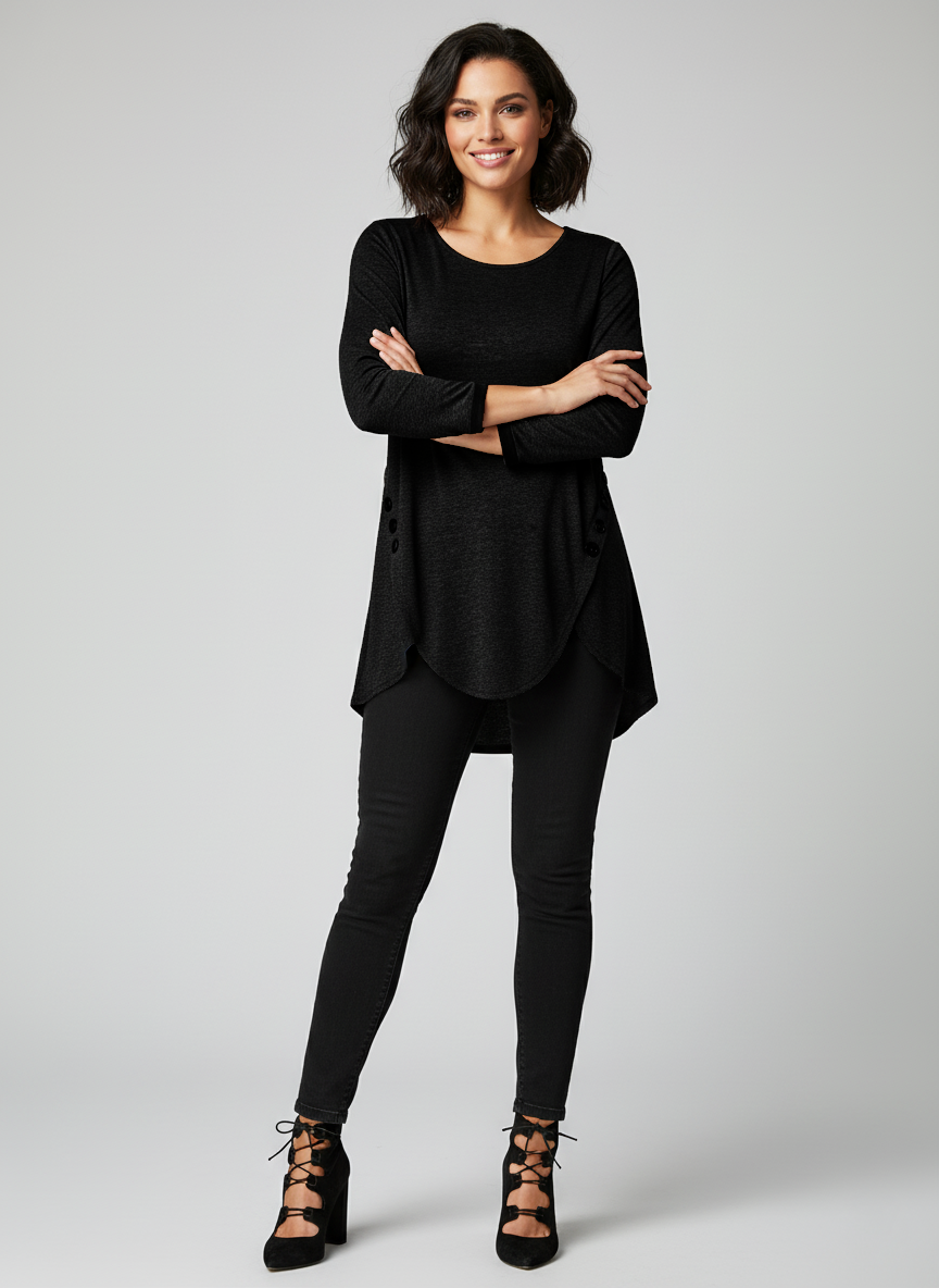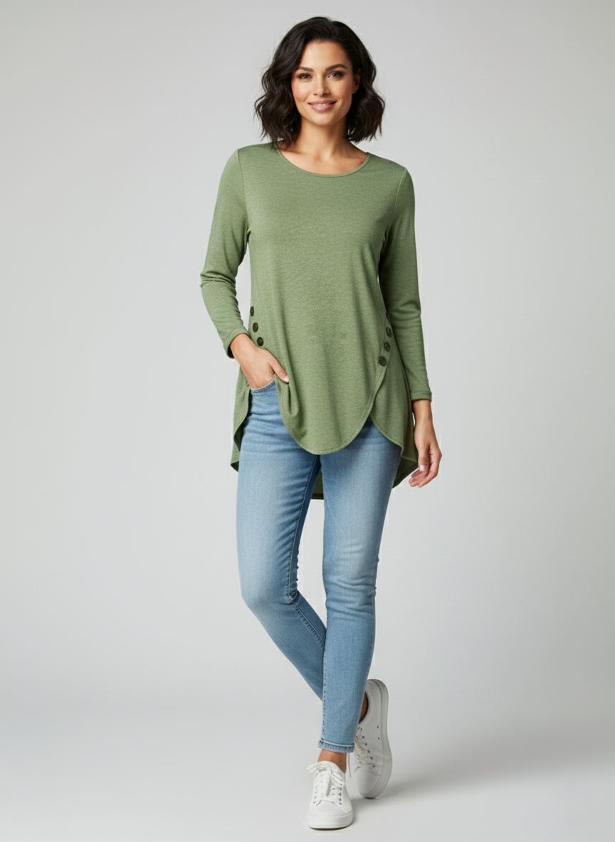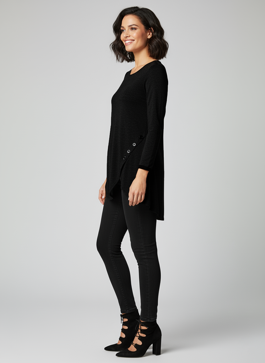 Irregular Button Hem Long Sleeved Round Neck Oversized T-shirt