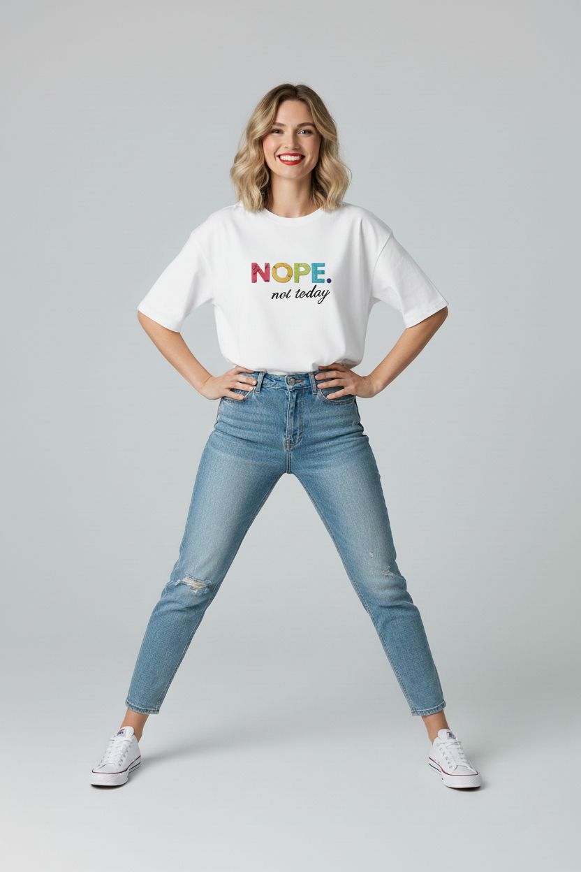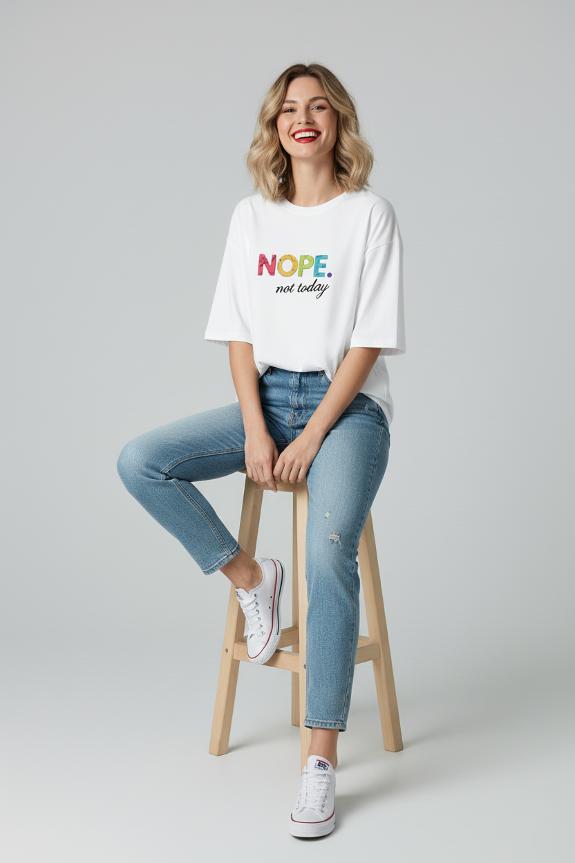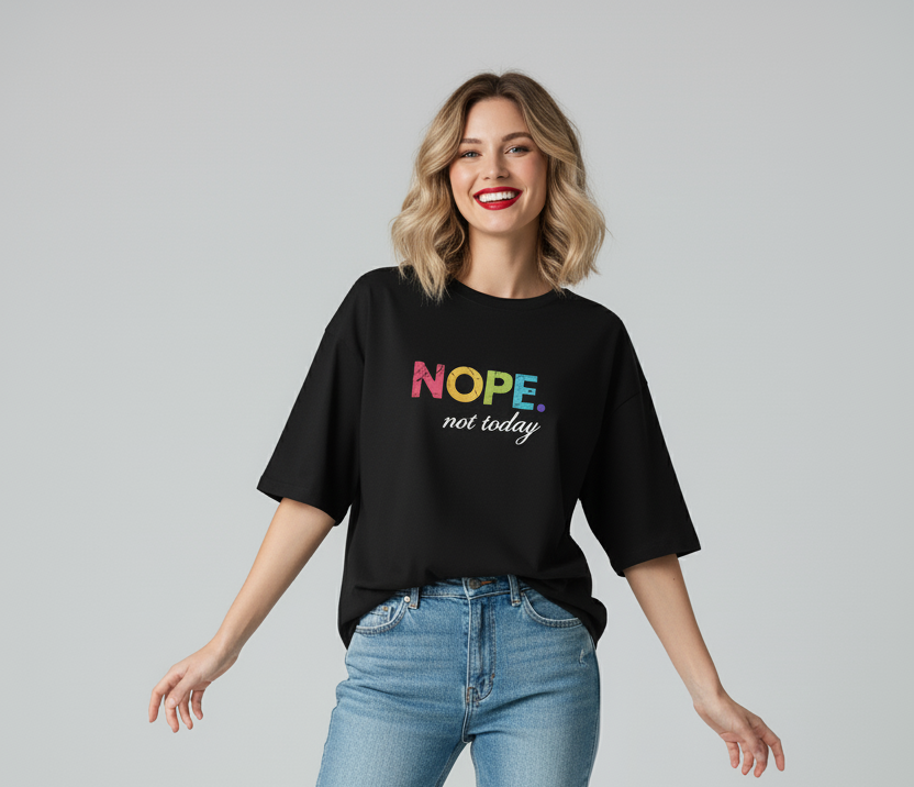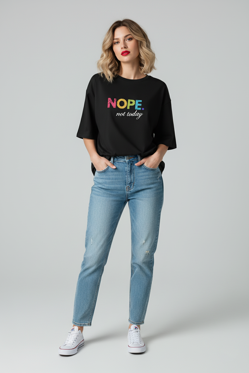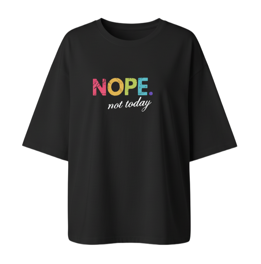 This Ladies Oversized Nope Not Today Short Sleeves T Shirt Top is perfect for those who want a comfortable and stylish look. Made with high-quality materials, it provides a relaxed oversized fit and features a bold "Nope Not Today" graphic. Stay cool and confident with this must-have top.
